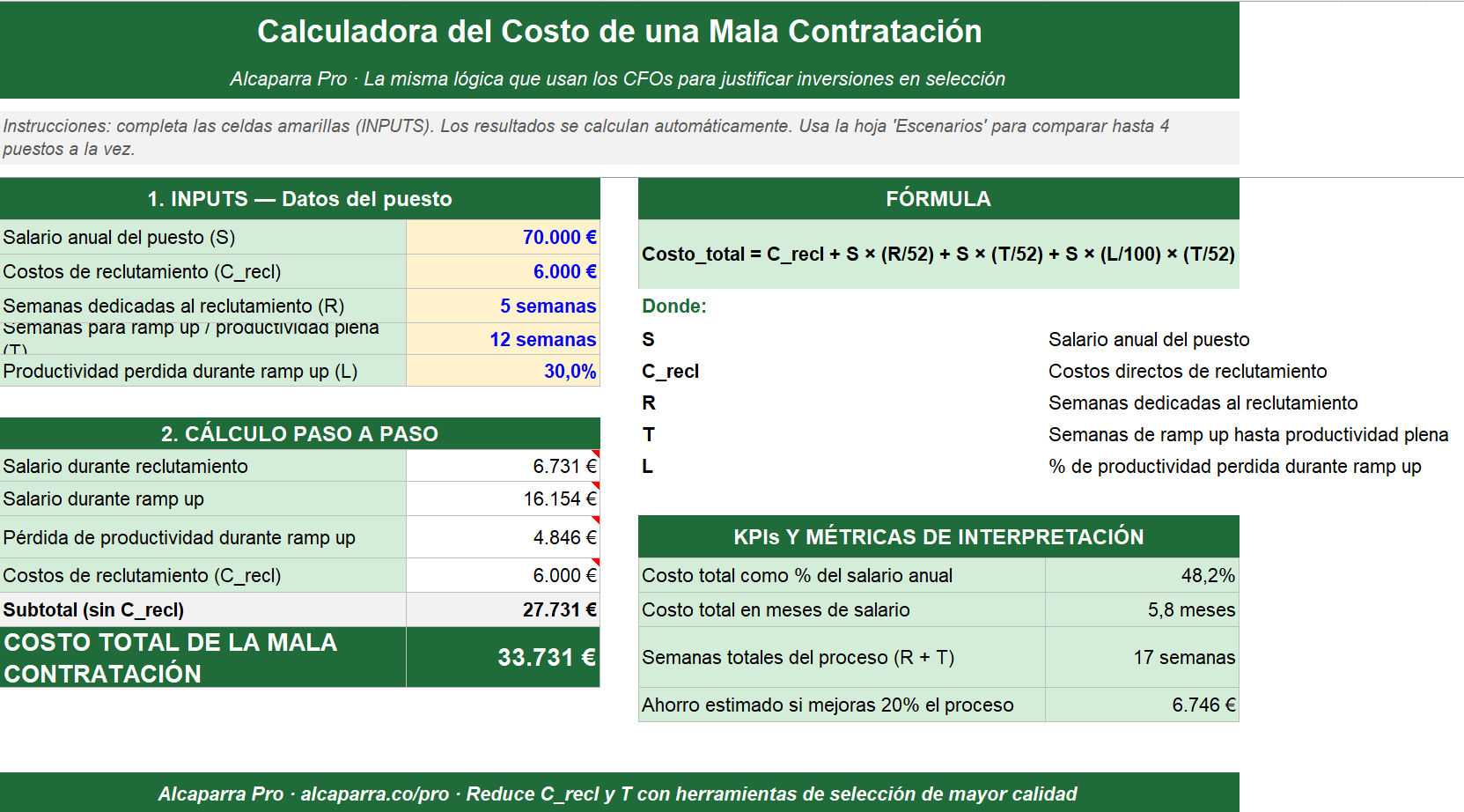 La plantilla incluye simulacion de escenarios: cambia los inputs para comparar, por ejemplo, que pasa si reduces el ramp-up con un mejor onboarding o si inviertes en un ATS mas eficiente.